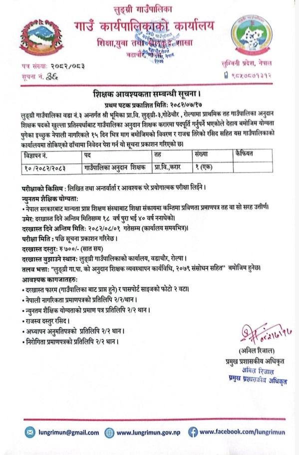 शिक्षक आवश्यकता सम्बन्धि सुचना