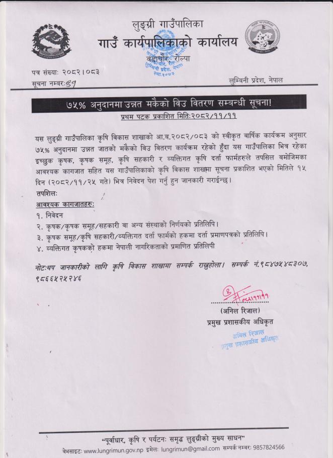 ७५% अनुदान उन्नत मकैको विउ वितरण सम्बन्धी सूचना