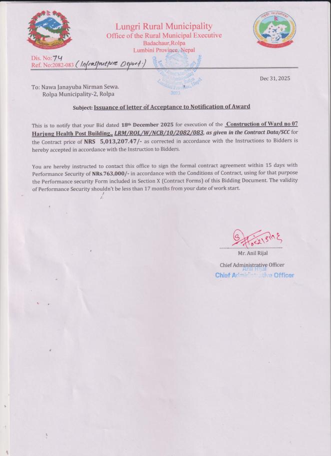 Issuance of letter of Acceptance to Notification of Award
