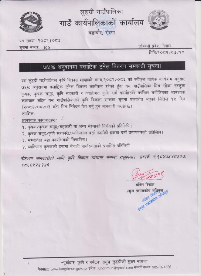 ७५%अनुदान प्लष्टिक टनेल वितरण सम्बन्धी सूचना