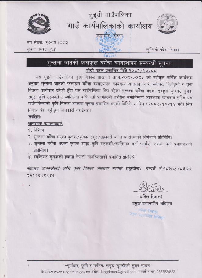 » सुन्तला जातको फलफूल बगैँचा व्यवस्थापन सम्वन्धी सूचना Second Time Notice