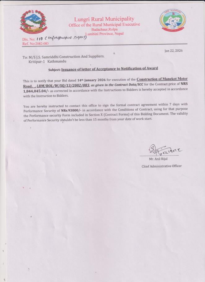 Issuance of letter of Acceptance to Notification of Award
