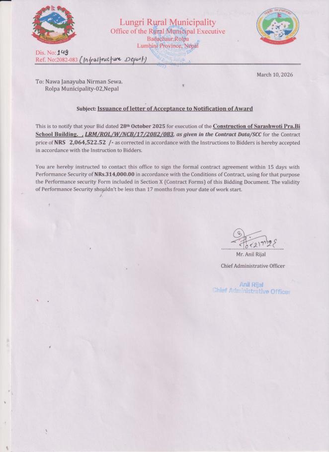 Issuance of letter of Acceptance to Notification of Award