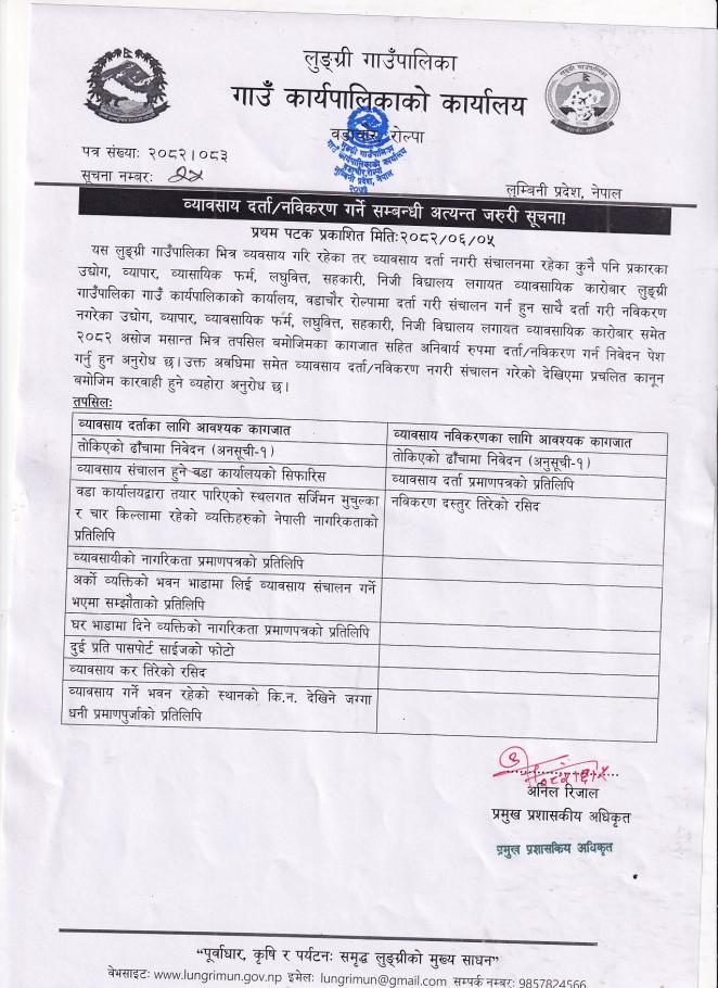 व्यवसाय दर्ता/नविकरण गर्ने सम्बन्धी अत्यन्त जरुरी सूचना ।