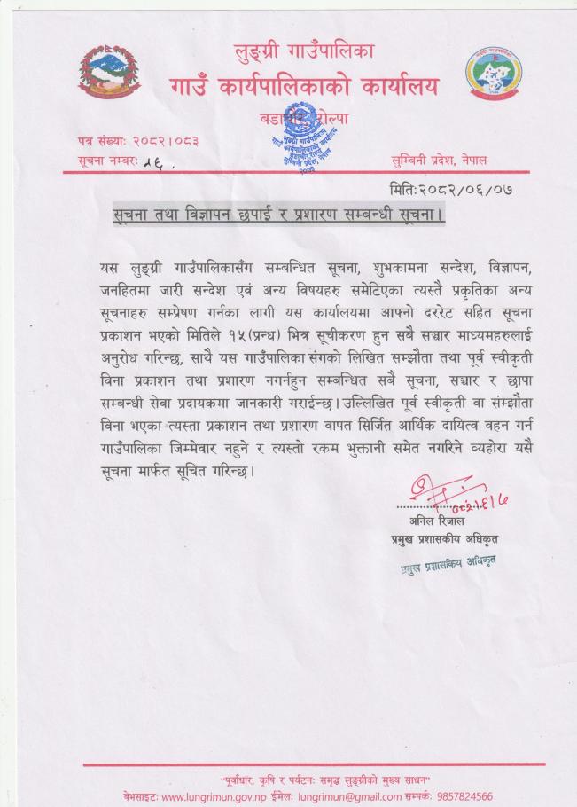 सूचना तथा विज्ञापन छपाई र प्रशारण सम्बन्धी सूचना ।