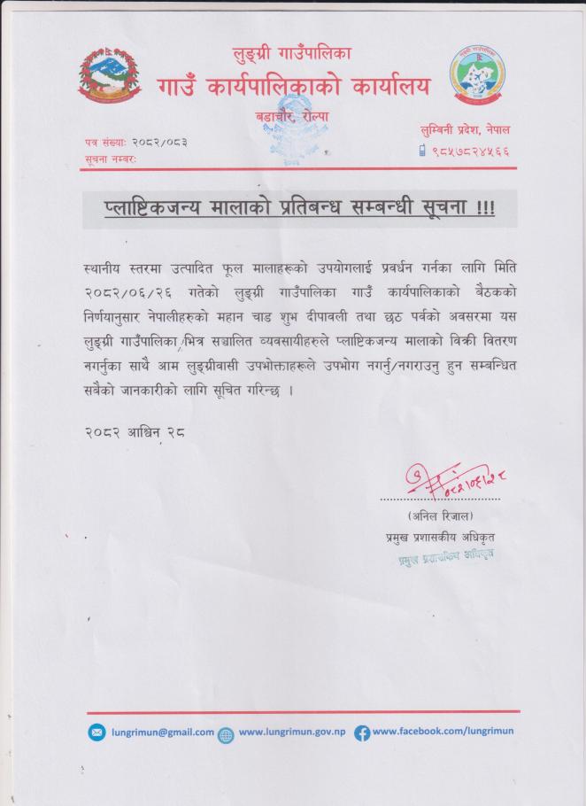 प्लाष्टिकजन्य मालाको प्रतिबन्ध सम्बन्धी सूचना